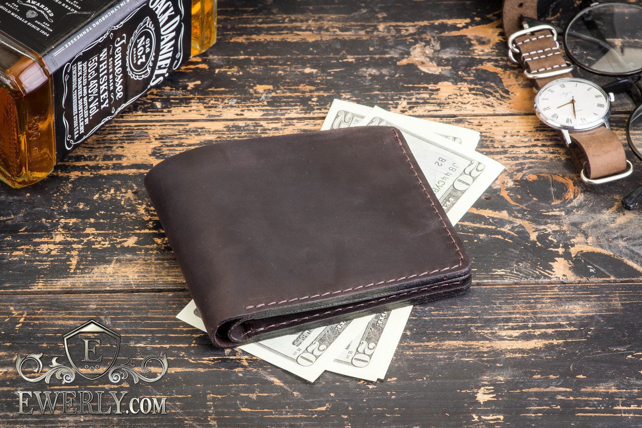 - Очень удобное и вместительное мужское кожаное портмоне тёмно-коричневого цвета, полностью является ручной работой. Два раздела для бумажных денег, оба вмещают в себя купюры всех номиналов, в том числе самые крупные. Имеет восемь разделов под банковские, кредитные карты, визитки или водительское удостоверение. Есть кармашек для мелочи, или же его можно использовать для маленькой флешки или SD карты.