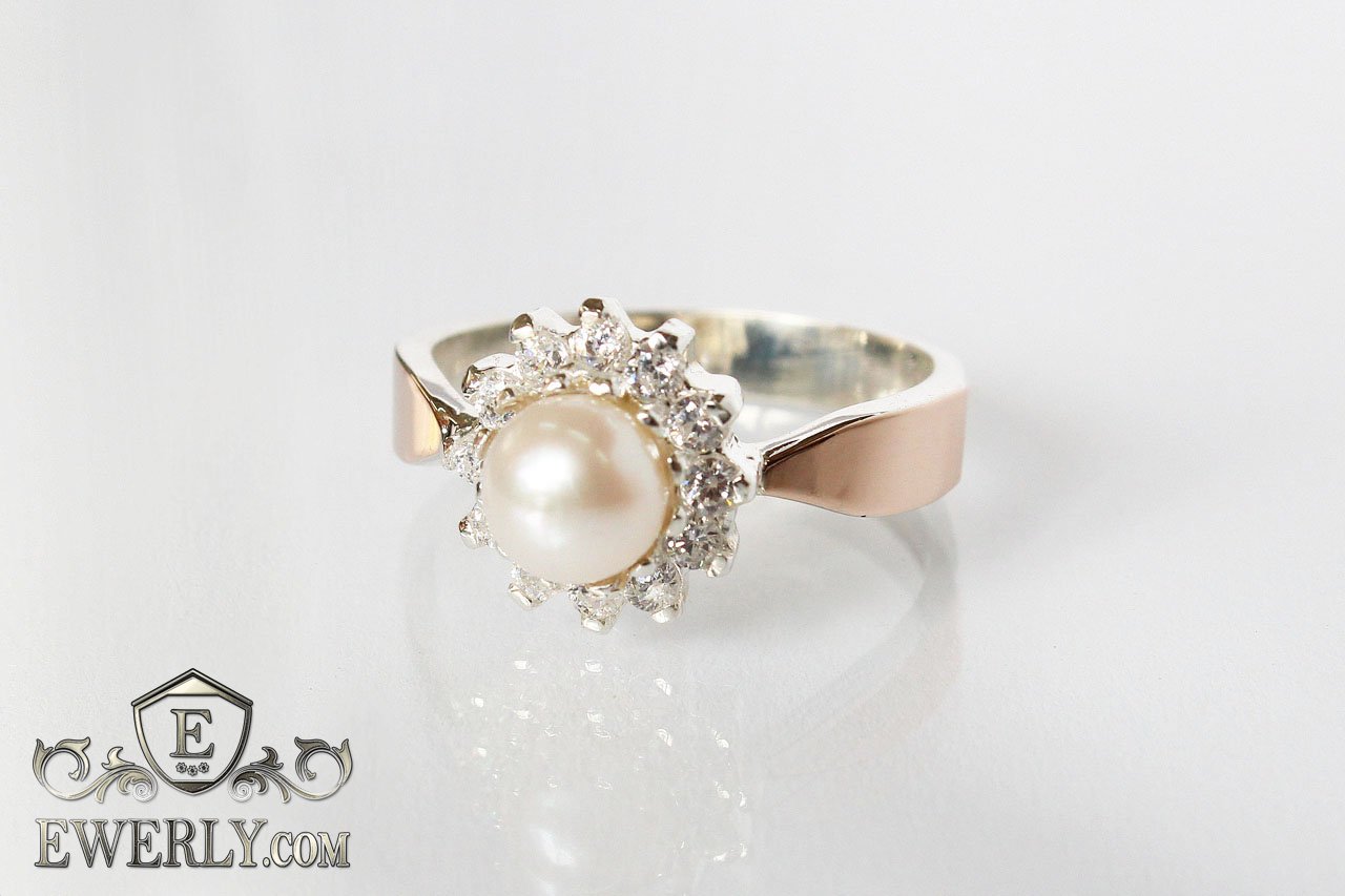 Женское кольцо из серебра 925 пробы с золотыми вставками 375 пробы с камнями (белый фианит в центре в виде жемчуга).