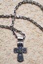 Изображено на кресте: Распятие Христово. Святая Троица. Святой Николай Чудотворец. Мученик Трифон. Три святителя. Икона Божией Матери "Толгская". Ангел Хранитель. Преподобный Сергий Радонежский. Святой Спиридон Тримифунский.1. Размер: 7 х 4 мм