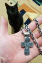 Крест обрамляет молитва. Это слова из Канона Кресту Господню: «Кресте всесильне, апостолов похвала, преподобных утверждение и верных знамение, иерархов и мучеников слава, победа и утверждение всех хвалящих тя. Кресте Честный, хранитель души и тела буди ми, образом своим бесы низлагая, враги отгоняя, страсти упражняя, и благословение даруя ми, и жизнь и силу, содействием Святаго Духа, и честными Пречистыя мольбами».